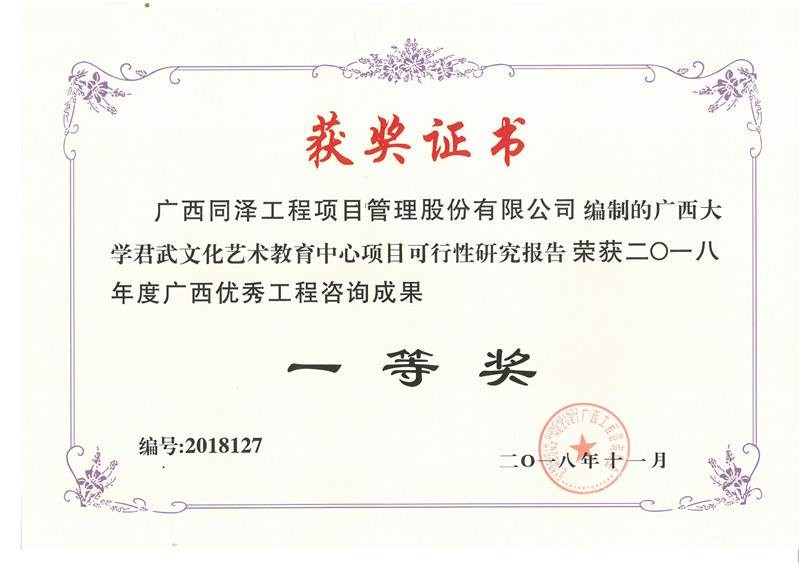 廣西大學(xué)君武文化藝術(shù)教育中心項(xiàng)目可行性研究報(bào)告榮獲2018年度廣西優(yōu)秀工程咨詢成果一等獎(jiǎng)
