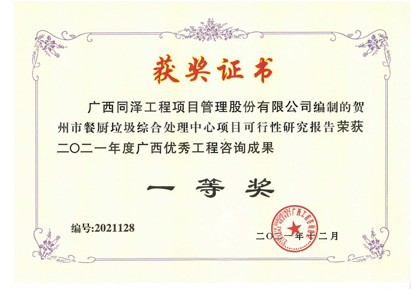賀州市餐廚垃圾綜合處理中心項目榮獲2021年度廣西優秀工程咨詢成果一等獎